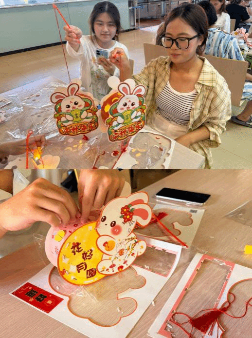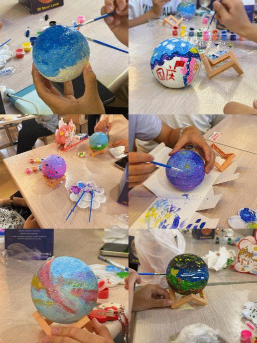 10月1日上午,在九栋学生公寓大厅的创意手工区,同学们执起画笔,在星球灯上涂抹丙烯颜料。一轮轮“圆月”在手中诞生,光影交织下,每一盏灯都成为独一无二的中秋印记,映照出每个人心中的家国梦想。另一侧在大家的巧手下则流出一只只玉兔形状的花灯,那形态各异的玉兔让人忍俊不禁,为中秋平添了一分趣味。