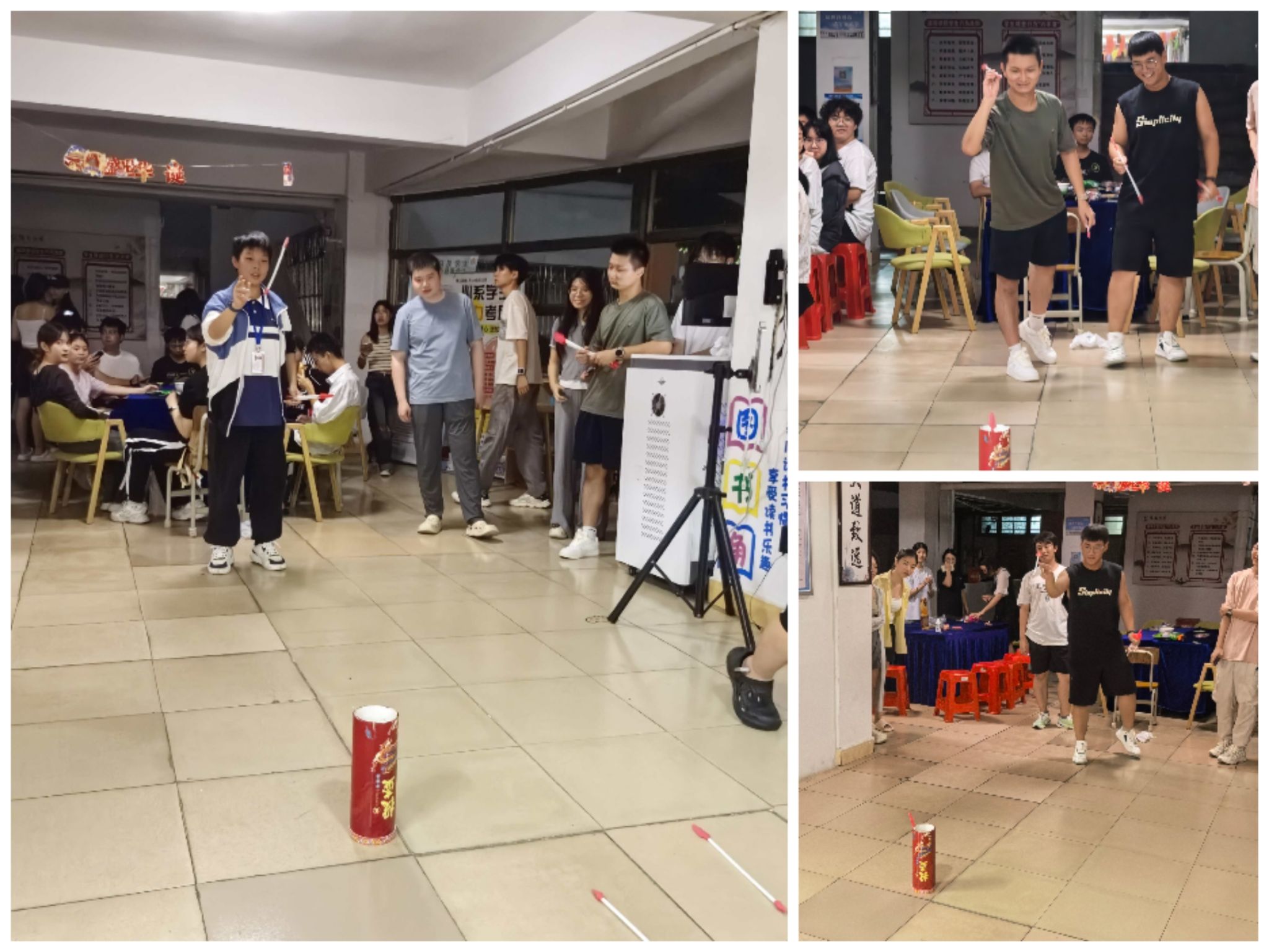 10月6日晚上,九栋学生公寓大厅传统投壶游戏前围满了跃跃欲试的同学,一支支羽箭划出弧线,投入壶中的清脆声响引来连连掌声。大家手持箭矢,屏息凝神,瞄准壶口轻轻一掷,箭矢入壶的瞬间,周围便响起阵阵欢呼与喝彩,失利时的惋惜与成功时的雀跃交织,满是青春的鲜活气息。