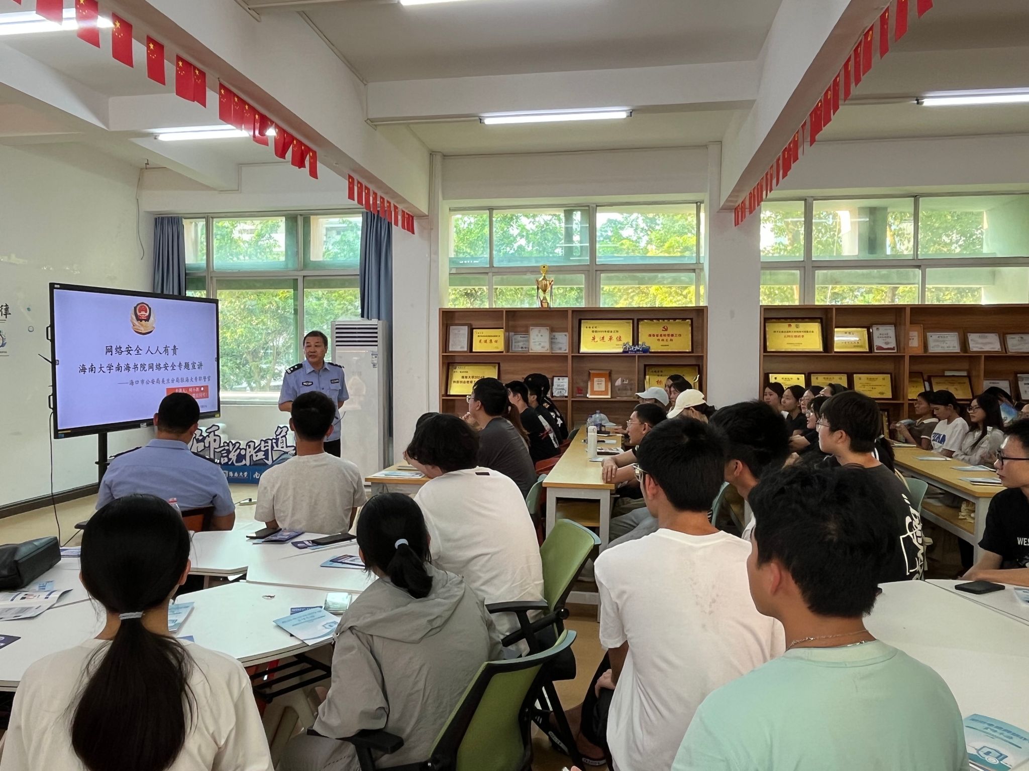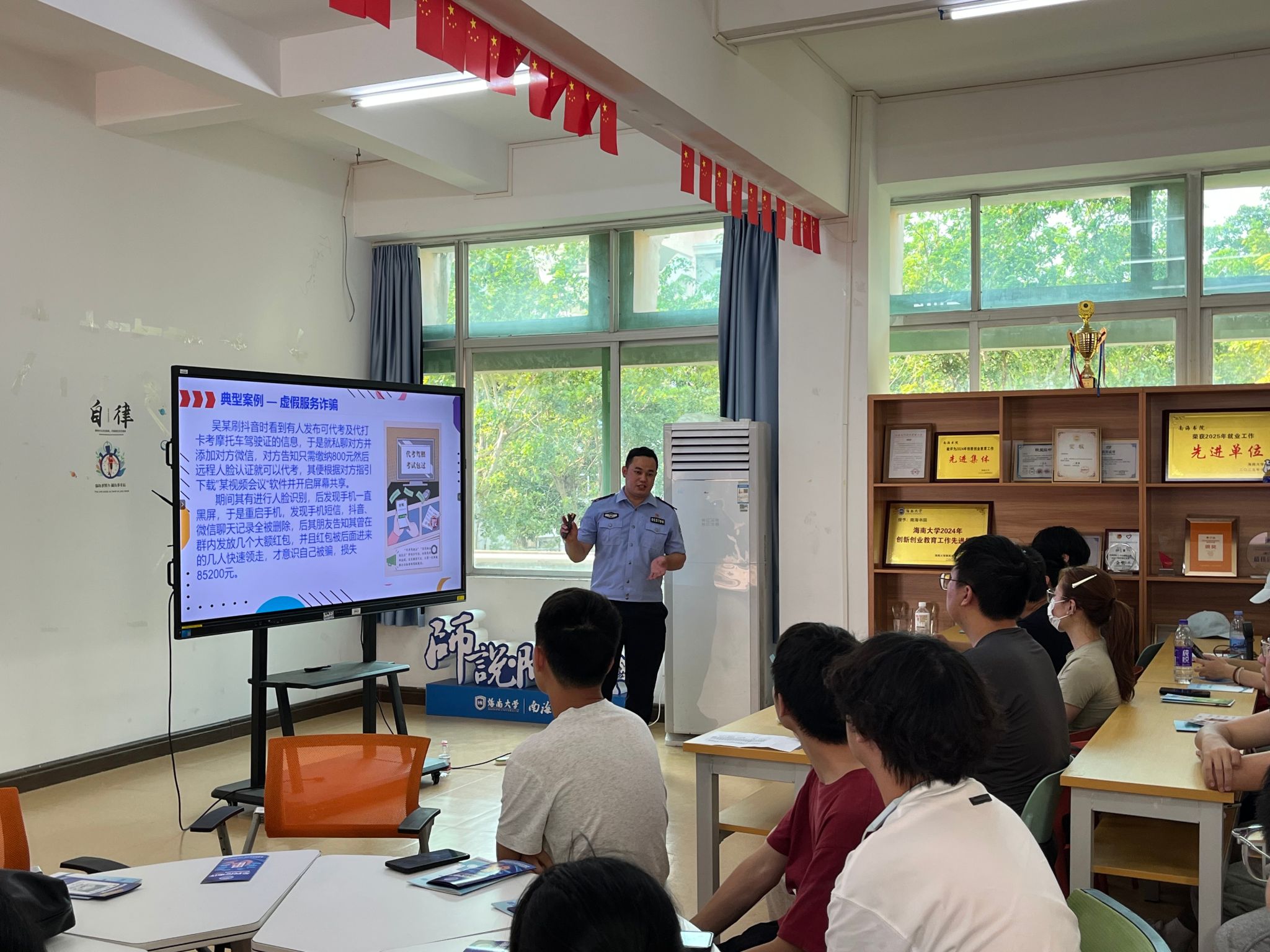 为提升学生的安全风险防范意识,树立总体国家安全观,4月14日下午在10栋2楼共享空间,南海书院开展了网络安全教育主题班会。为提升活动的专业性和权威性,书院邀请到了驻校专职警官何小林,以及海口市公安局反电信网络诈骗中心警官侯斌担任主讲,50余名学生参与。